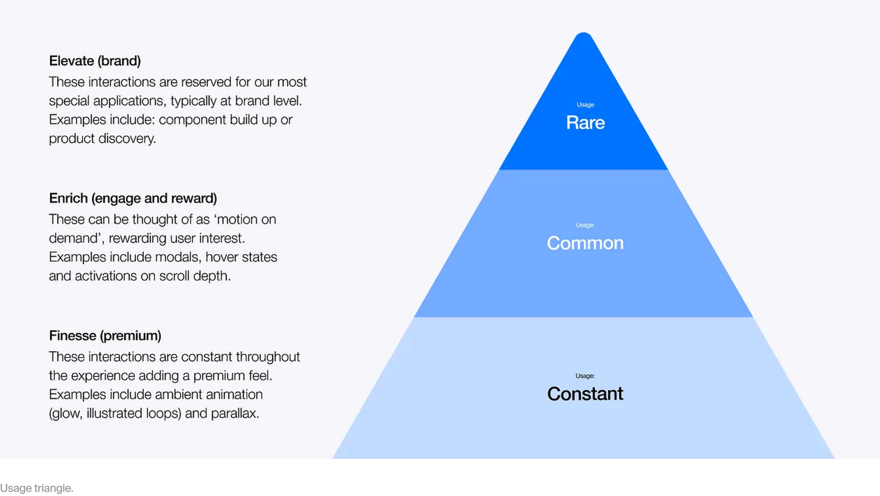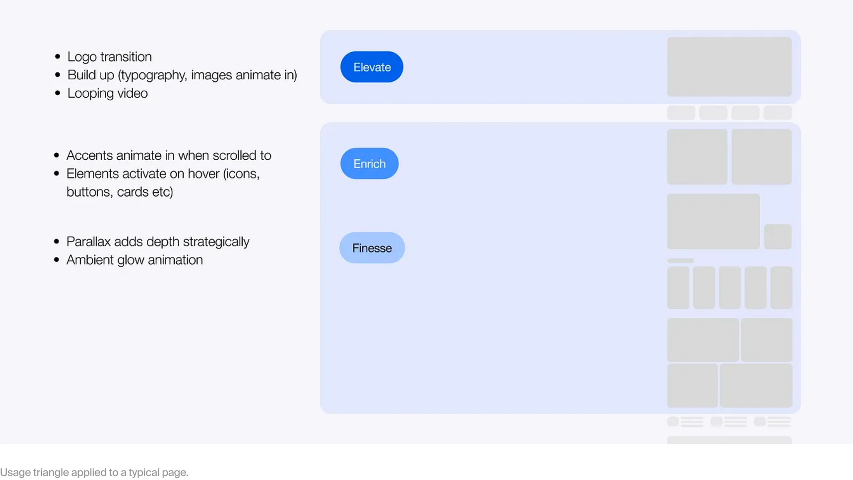 To these ends we created a usage triangle that gave three ‘purposes’ for motion beyond conveying essential information: Elevate, Enrich and Finesse. These purposes have a proportional relationship to the extent to which they are used. In general the more the dramatic the motion the more limited its usage.