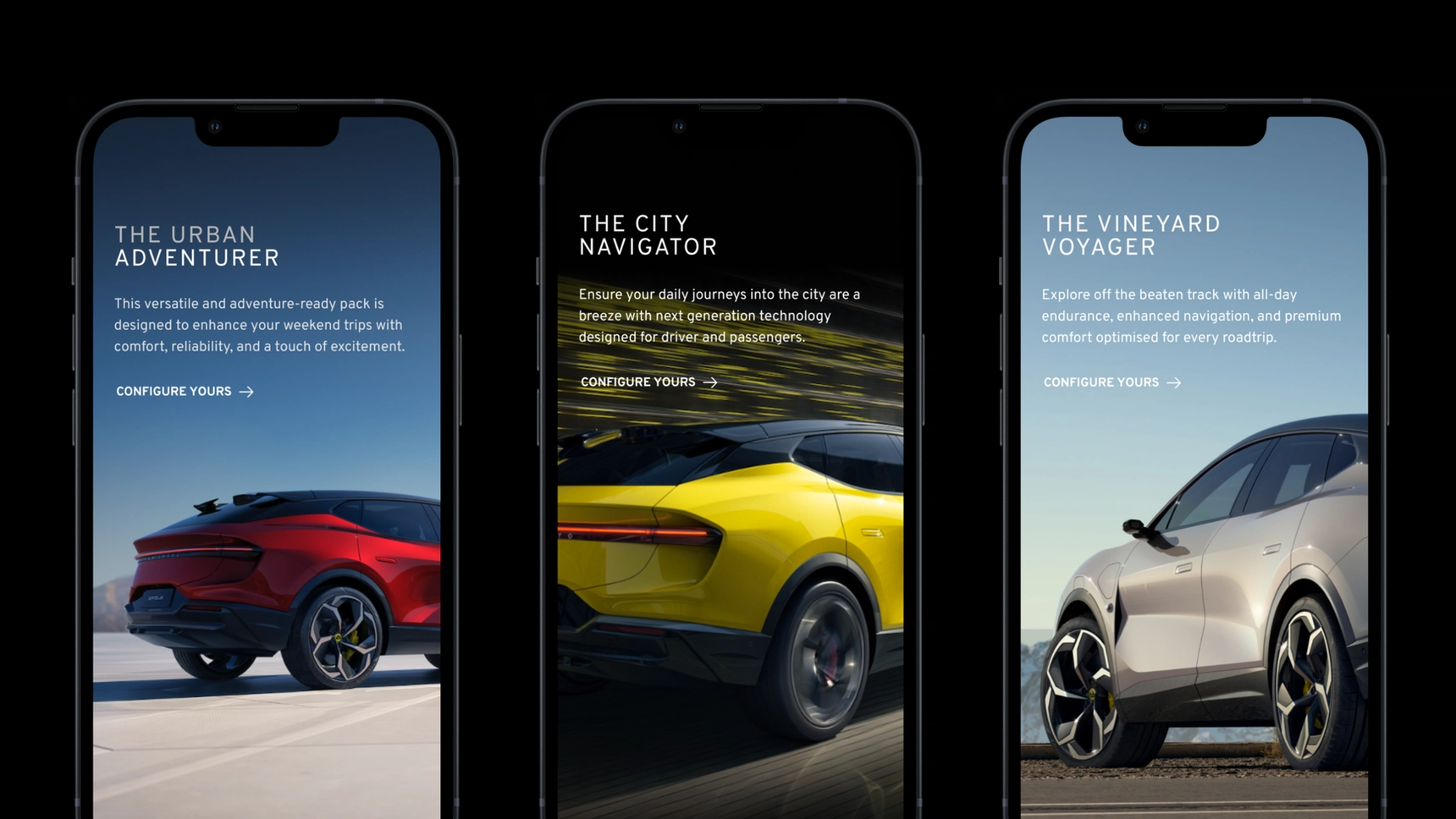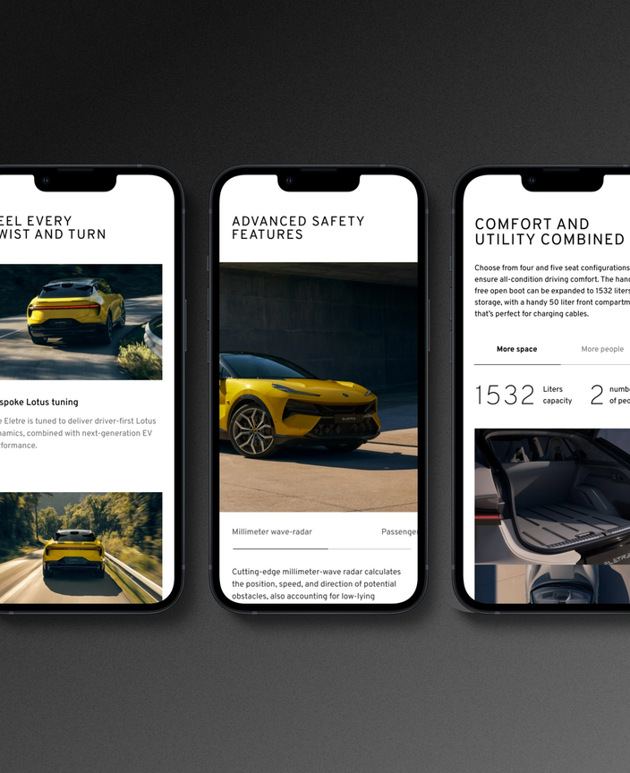We created a completely new vision for showcasing the Lotus cars on the .COM, shifting from a feature-led to an experience-driven approach. Using experiential themes such as ‘Explore,’‘Drive’, and ‘Life’ we humanise technical features and give users a real sense of how the car would fit into their lives.