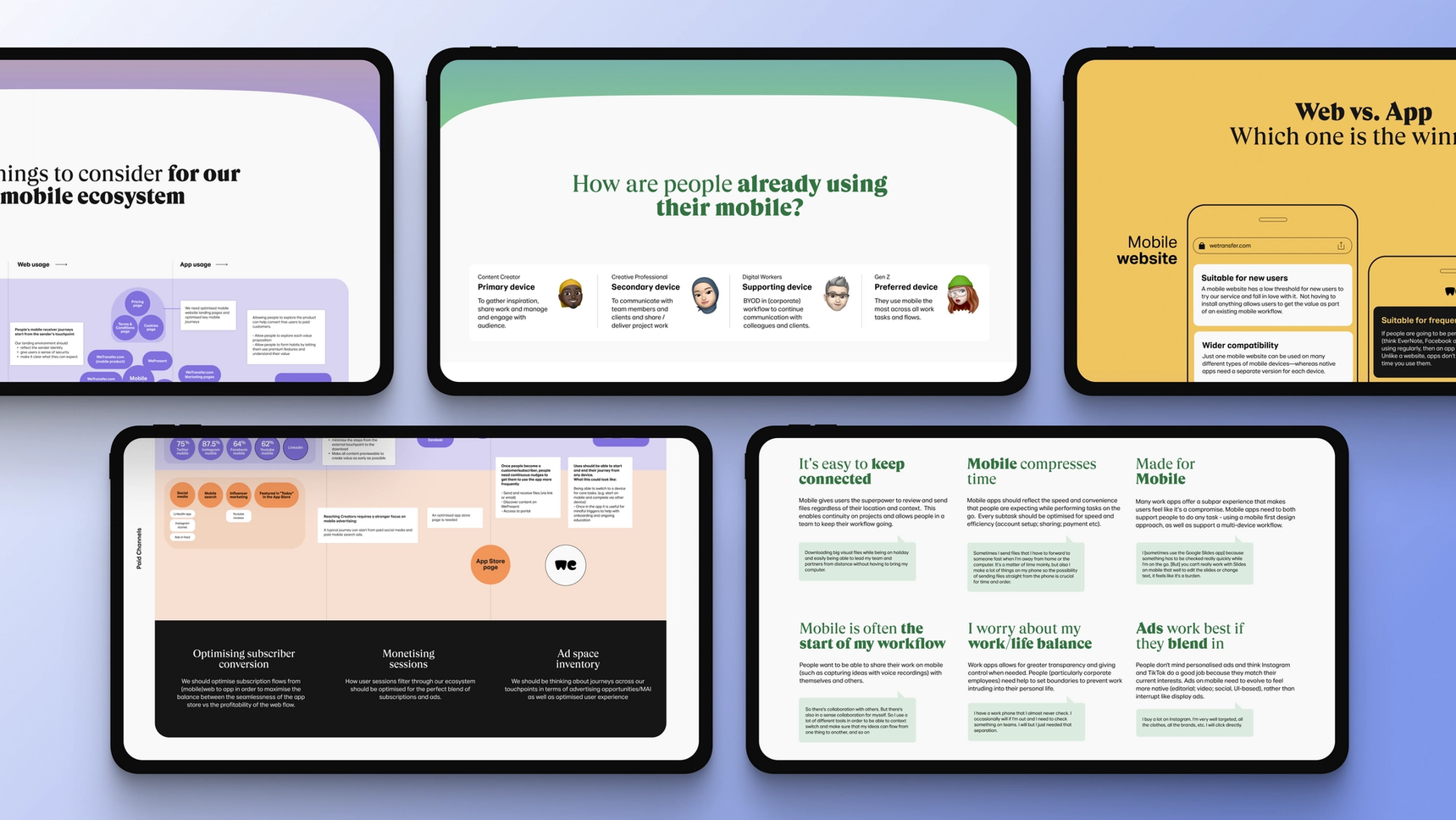 WeTransfer wanted code d’azur to discover and understand the mobile needs of their customer segments and identify mobile-specific value propositions to drive subscription revenue. After identifying the three most impactful ideas, we turned them into high level user flows to bring these concepts to life. With the Red Ocean – Blue Ocean strategy in mind, these three creatives routes are a vision for the future based on real insights.